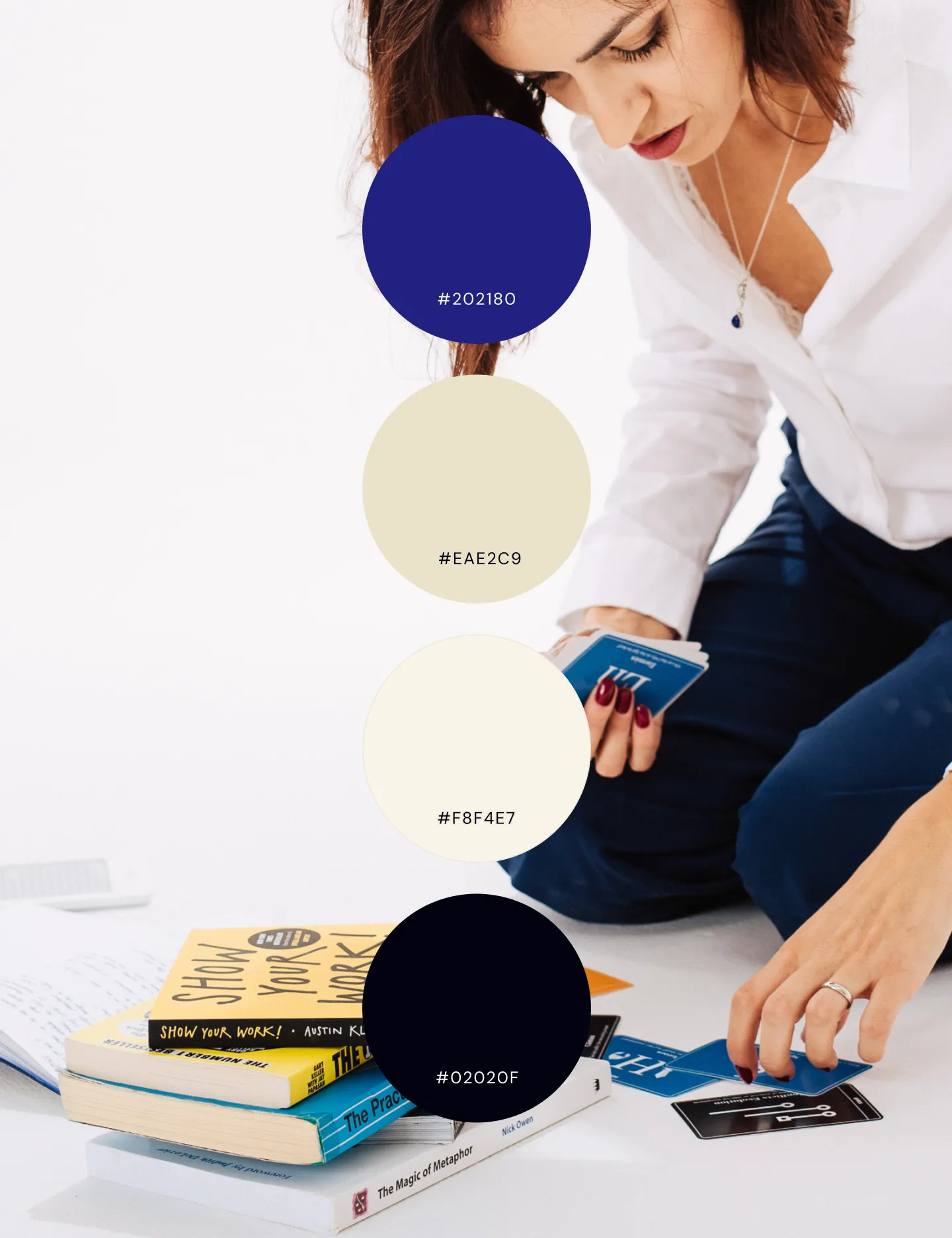 Paleta spaja plavu i crnu s nježnim bež tonovima, stvarajući osjećaj elegancije, povjerenja i suptilne odvažnosti brenda.