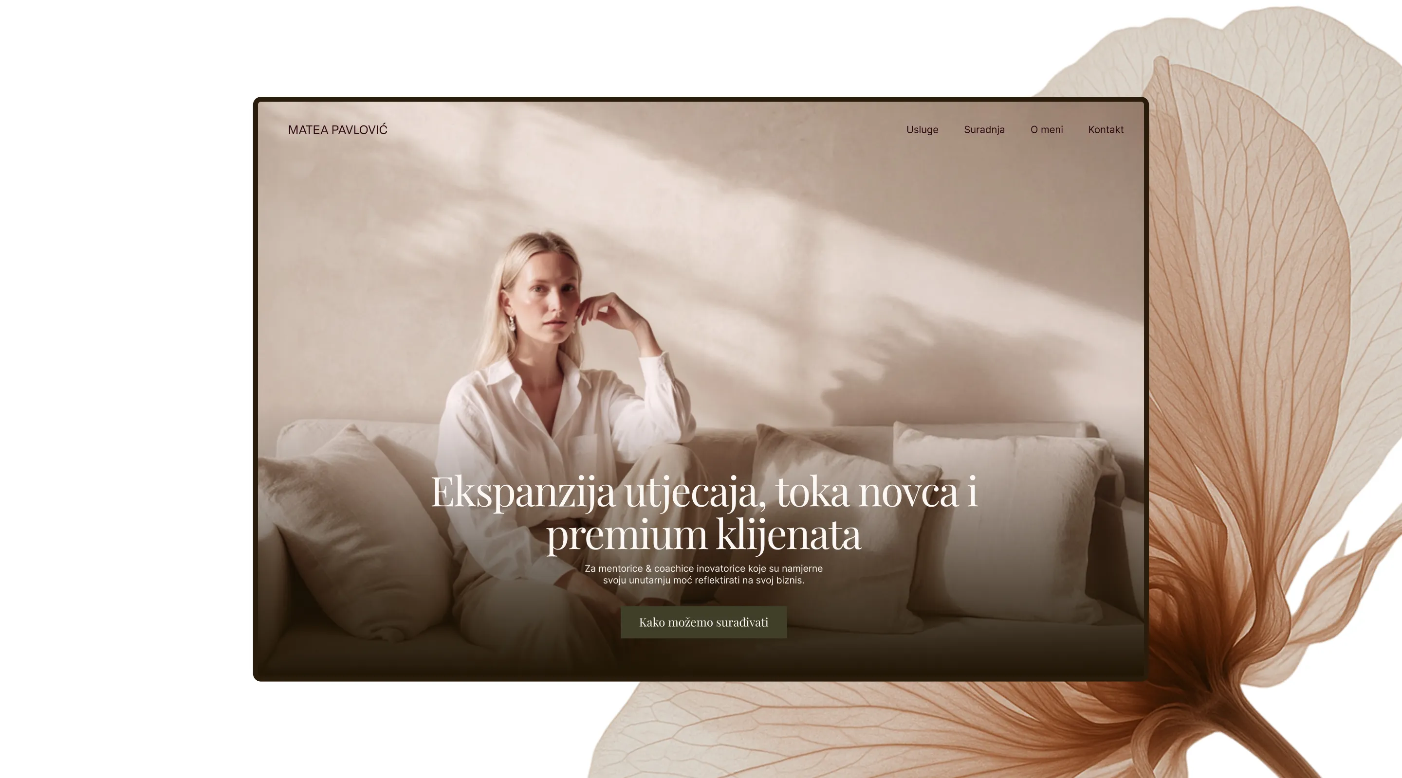 “... Prvo, cijeli branding je prekrasan da zadnjih detalja. Osjećam da smo kroz tvoj proces na površinu izvukle najekspanzivniju mene i preveli ju u boje i oblike. Izgleda kao ja. Stvara osjećaj koji u svojim klijenticama stvaram ja. A moj osjećaj kad si mi dostavila sve finalne materijale je bio čista preplavljenost radošću koliko je lijepo, ekspanzivno i podržavajuće imati nešto toliko vizualno sofisticirano i u skladu sa sobom... Već sam ti rekla - ja sam tvoja zauvijek klijentica jer teško da tko može nakon ovoga premašiti ovako precizno prevođenje mene iznutra u vizualni aspekt izvana...”